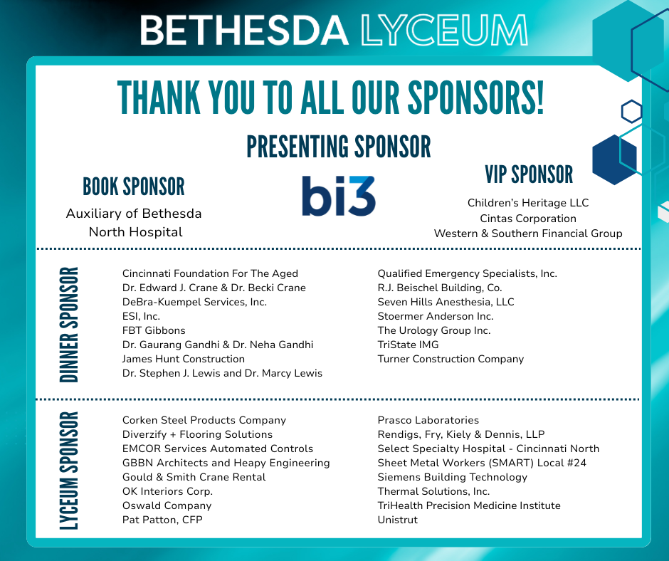 Thank you to all of our sponsors and guests who supported our 25th annual Bethesda LYCEUM event. Because of you, we raised $325,000 to contribute towards DNA Discovery with TriHealth: A Population Health and Genomics Research Project.